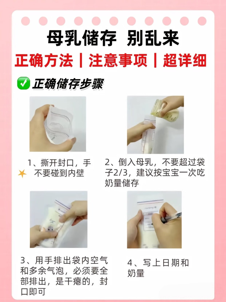 小请示: 储存的时刻,别忘了在储奶袋上写了了“日历”和“容量”。日历从前去后吃,容量提议按宝宝一顿的量来存(比如60-120ml),幸免解冻了一整袋喝不完,又没法从头冻且归,形成销耗。