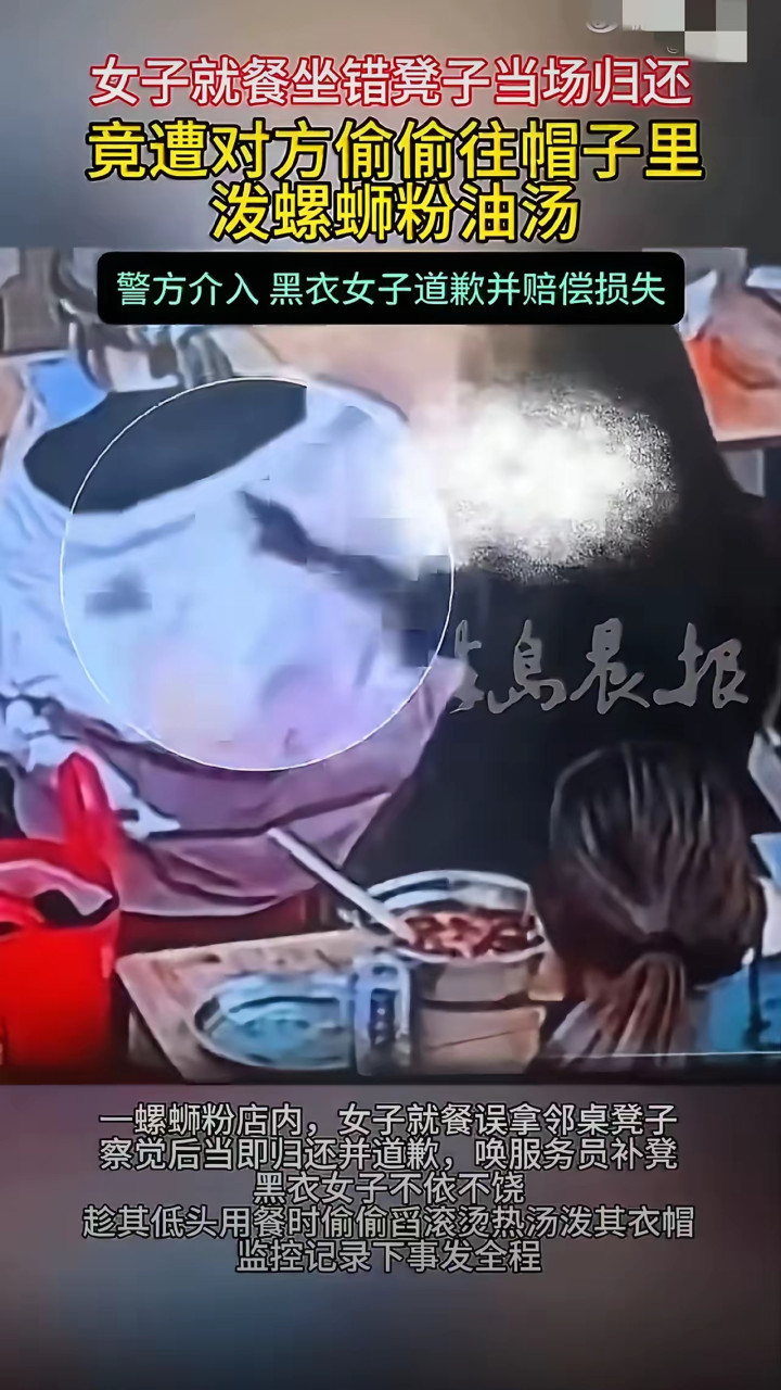 事情启事很小,螺蛳粉店岑岭期,一位女士误拿了邻桌预留的凳子,发现后坐窝归还、反复谈歉,气派至极老师。可邻桌这位黑衣女子,却诉苦在心,趁对方垂头吃饭时,将滚热的螺蛳粉汤暗暗倒进东谈主家的帽子里。本领掩饰、心念念歹毒,监控曝光后,全网齐怒了。