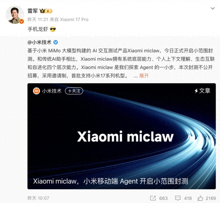 {jz:field.toptypename/}3月6日,小米认真启动出动端系统级智能体Xiaomi miclaw的小范围封闭测试。雷军在转发公告时只写了三个字:"手机龙虾"。这是小米对OpenClaw欢跃的正面回答,亦然手机厂商"养虾"波浪中最初亮相的那一只。意味着这场AI Agent转变的战场,认真从极客的电脑延长到了平方用户的手机。