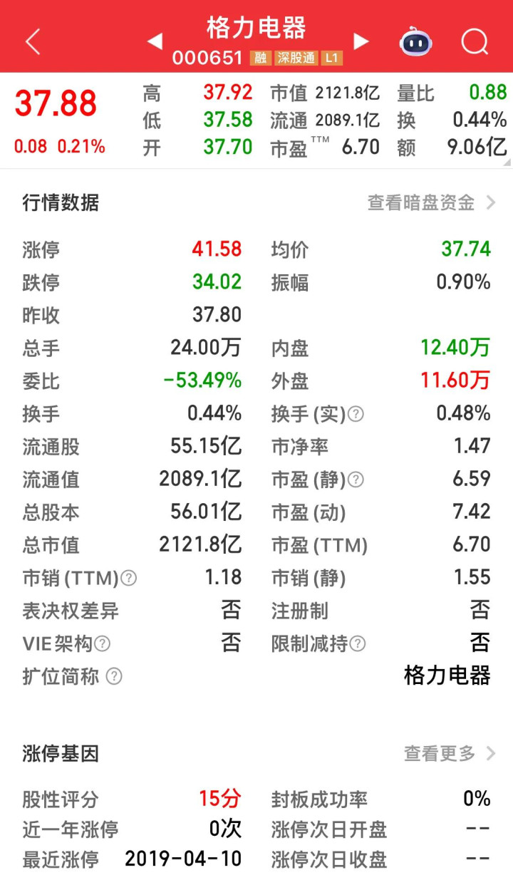 平直说中枢数据:格力电器现时的动态市盈率,独一6.7倍。