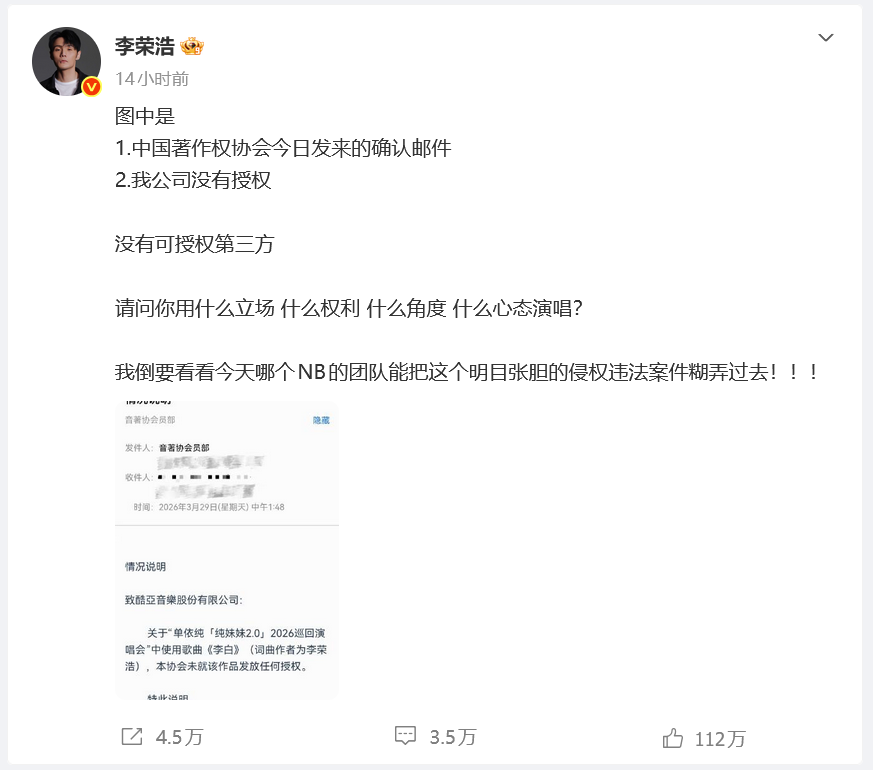 3月29日,李荣浩发文谴责28日单依纯方在莫得拿到翻唱《李白》授权的情形下,“强行侵权演唱”。