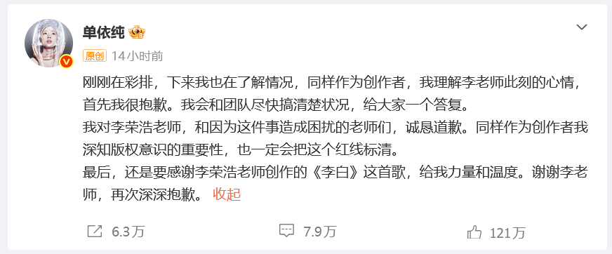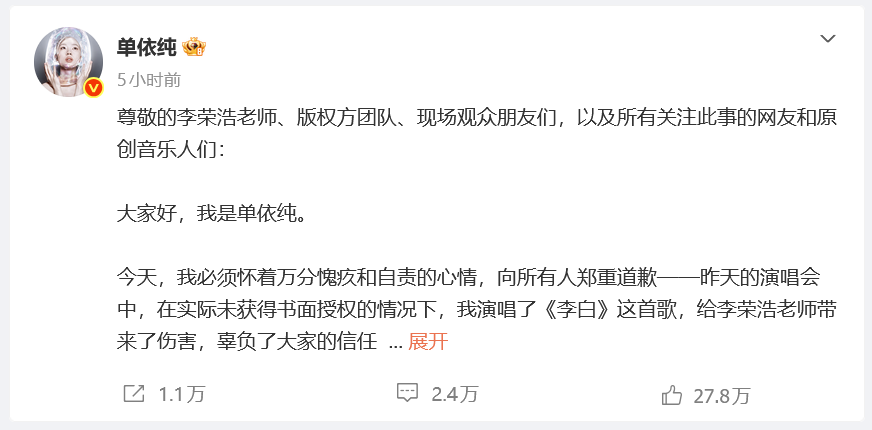 今天,我必须怀着万分傀怍和自责的表情,向通盘东谈主贵重谈歉——昨天的演唱会中,在本体未得回书面授权的情况下,我演唱了《李白》这首歌,给李荣浩敦厚带来了伤害,亏负了众人的信任,我在此向通盘受影响的一又友致以最真诚的歉意。