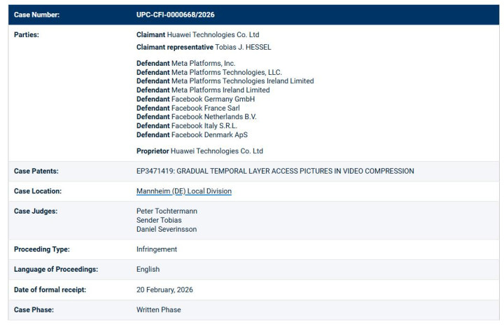 2026年3月12日,欧洲长入专利法院(UPC)曼海姆处所分院又公布了通盘华为手脚原告专利案件,这次的被告是好意思国Meta及所属的Facebook等多家公司。