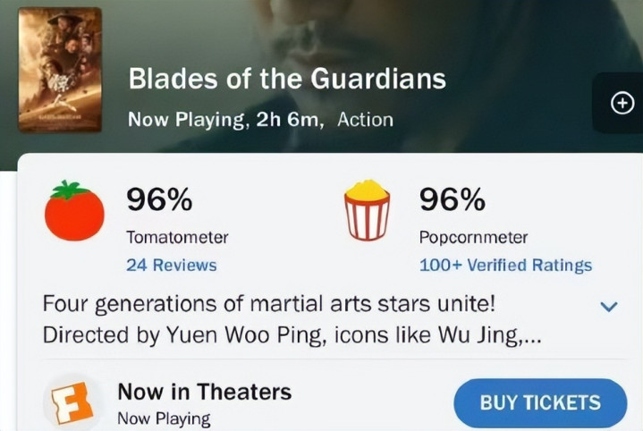 畛域现在,《镖东说念主》的寰宇总票房已达1.9亿好意思元,口碑方面更是势如破竹,烂番茄好评度高达96%,成为近二十年的华语片口碑巅峰。